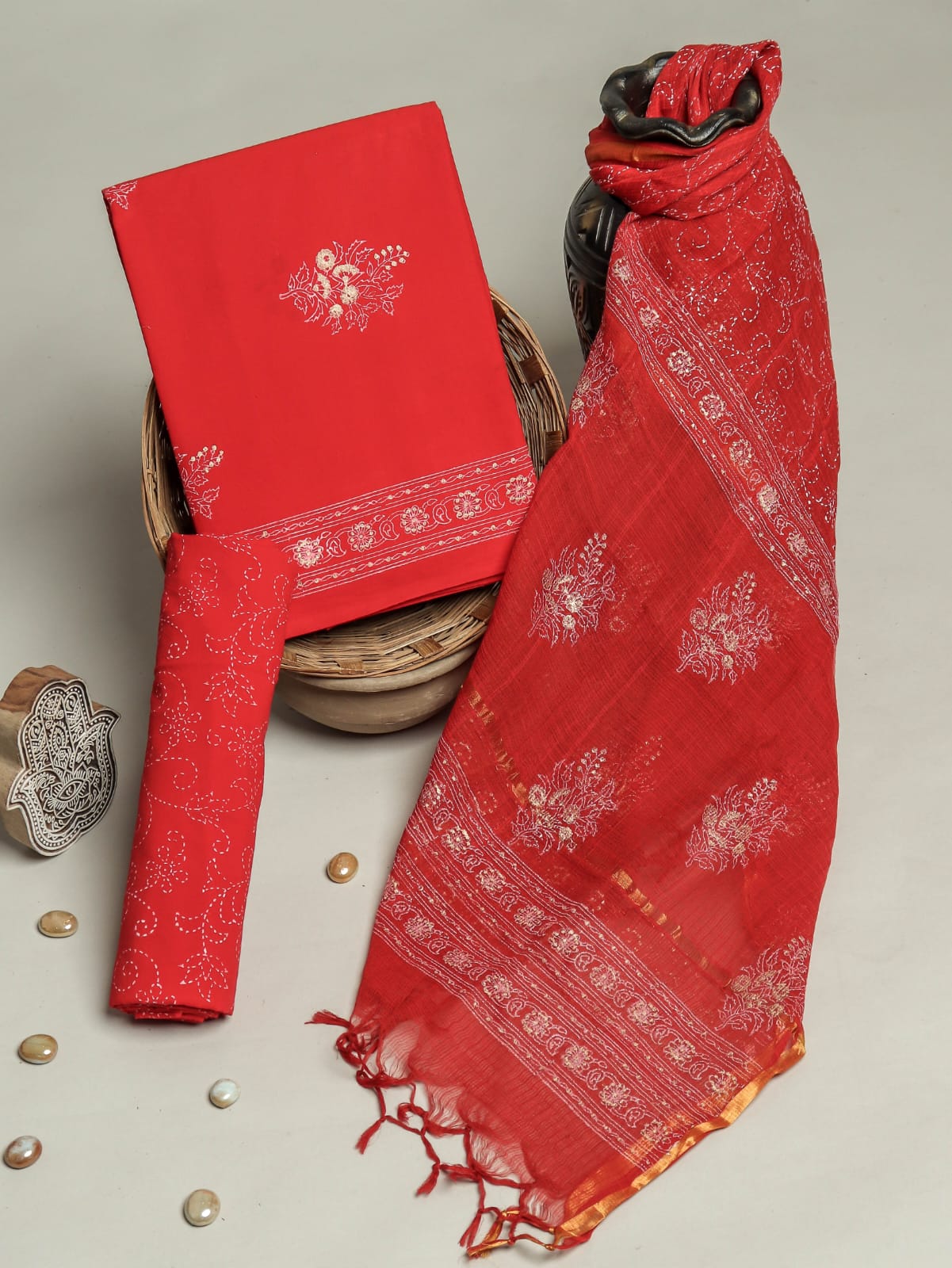 Shop Unstitched Block Print Cotton Suit Set with Kota Doria Dupatta.